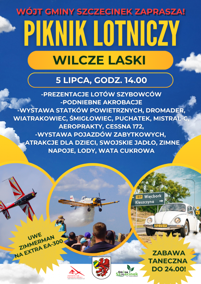 Wójt Gminy Szczecinek wraz z Aeroklubem Koszalińskim serdecznie zapraszają wszystkich miłośników lotnictwa, rodziny z dziećmi i spragnionych dobrej zabawy na Piknik Lotniczy, który odbędzie się już 5 lipca br. na Lądowisku w Wilczych Laskach.