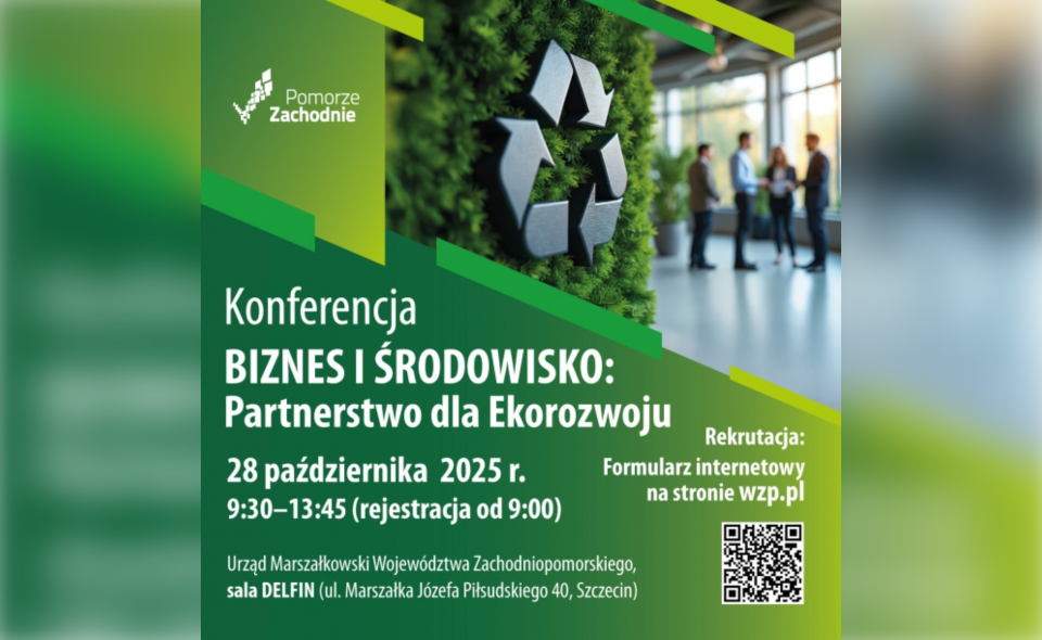Urząd Marszałkowski Województwa Zachodniopomorskiego – Wydział Ochrony Środowiska wraz z Gabinetem Marszałka, Biuro ds. Sieci Punktów Informacyjnych – serdecznie zaprasza na konferencję "BIZNES I ŚRODOWISKO: Partnerstwo dla Ekorozwoju", której celem jest zbudowanie mostu między światem biznesu a regulacjami środowiskowymi. Naszym zamiarem jest przybliżenie przedsiębiorcom ich ustawowych obowiązków w przystępny i zrozumiały sposób, pokazując, że Urząd to partner wspierający rozwój ekologicznych inicjatyw.